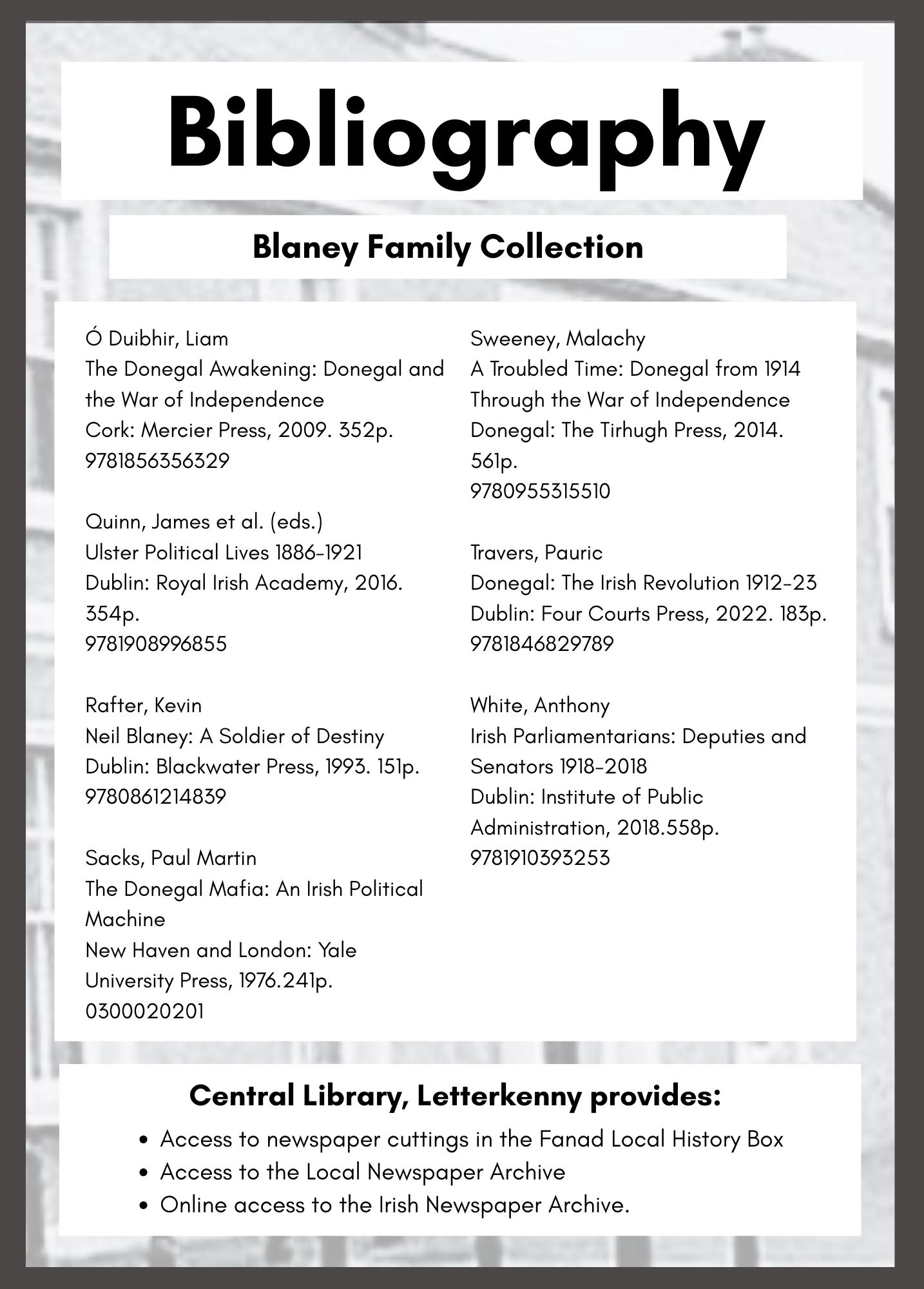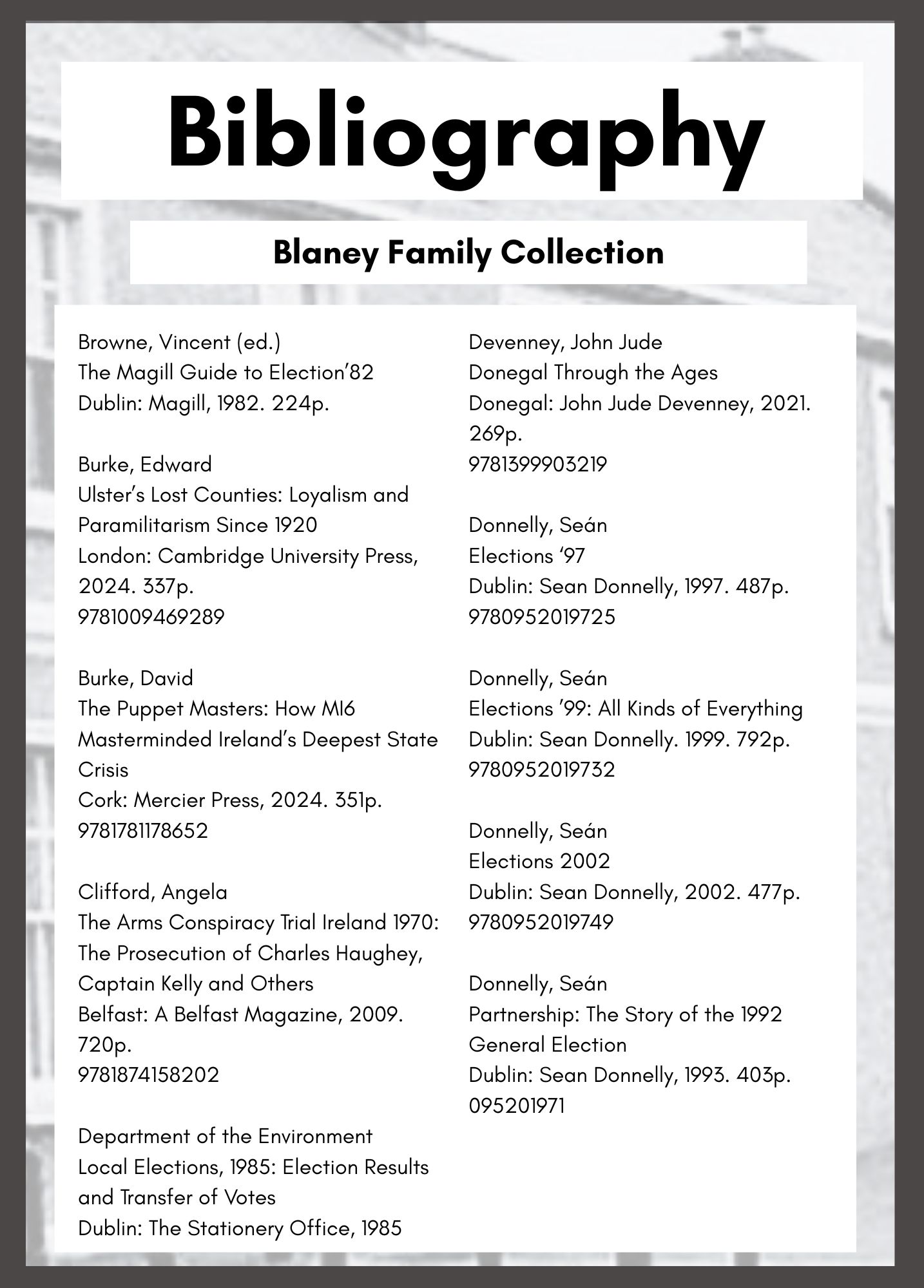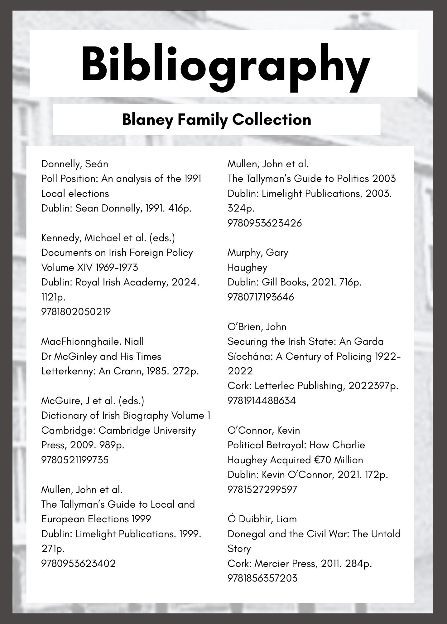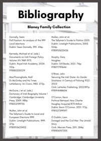 In 2025 the Blaney Family celebrated 100 years of continuous political representation on Donegal County Council. The event was marked with a Civic Reception at County House Lifford for which this bibliography was compiled.