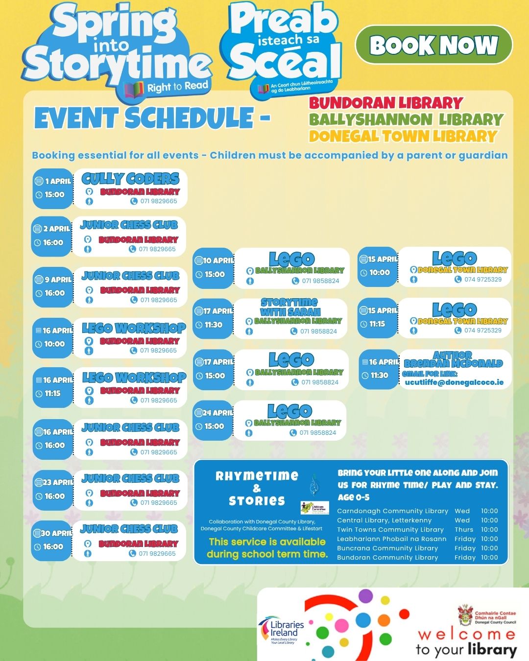 Tá lúcháir ar Sheirbhís Leabharlainne Chontae Dhún na nGall clár iontach scéalaíochta agus imeachtaí a chur i láthair a thacaíonn le teaghlaigh le teacht an earraigh i mí Aibreáin seo.